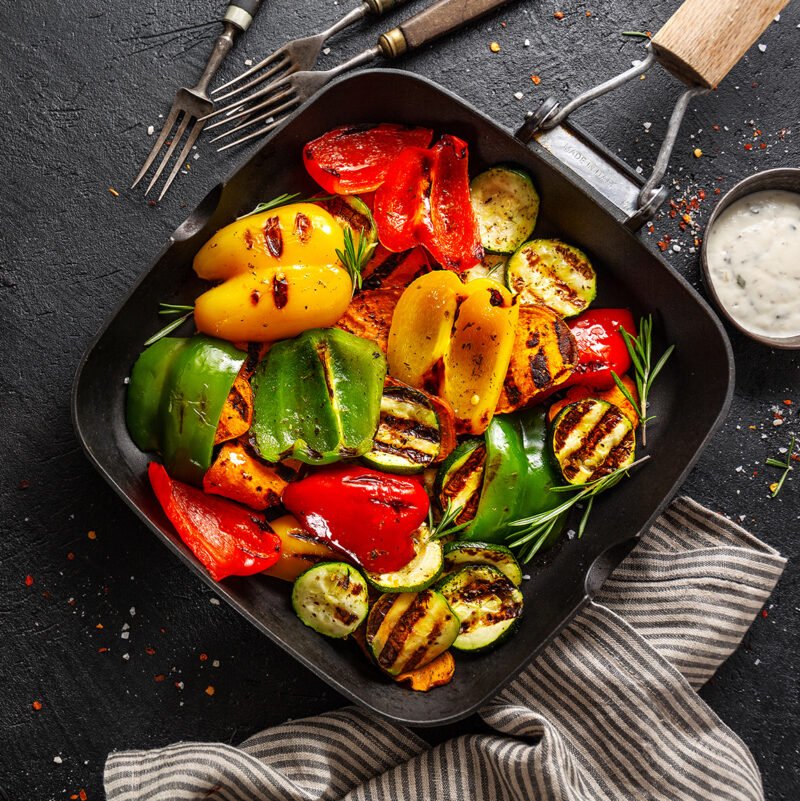 Tasty grilled vegetables on pan on dark background. Healthy food, summer food concept.